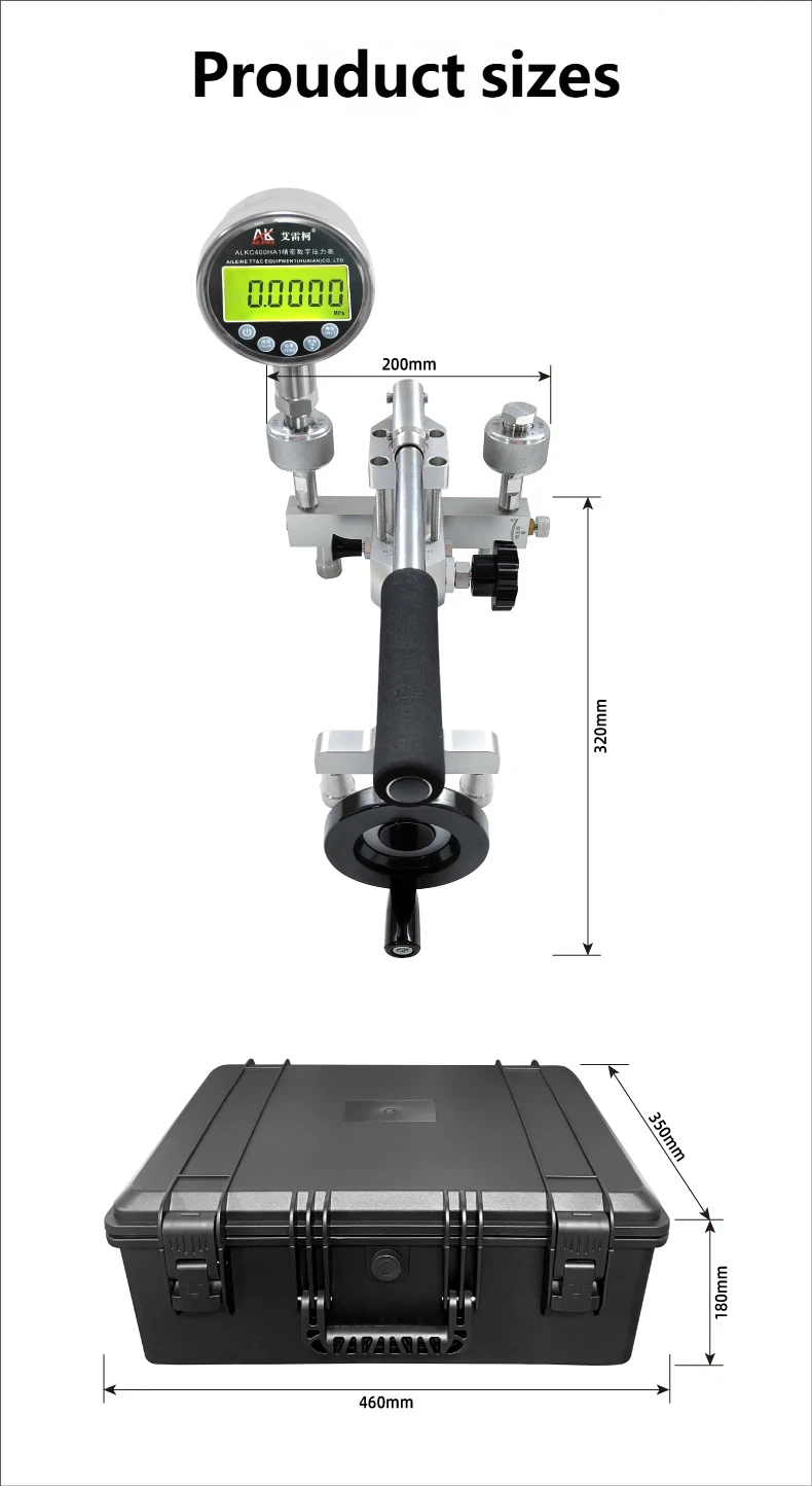 | Standard Product Configuration | Certificate of Conformity × 1, User Manual × 1, Warranty Card × 1, Output Port Plugs × 2, Air Pressure Hose Connector × 1, Gaskets × 40, Teflon Tape × 1 roll, Pressure Conversion Adapters × 14, Instrument Case × 1 |