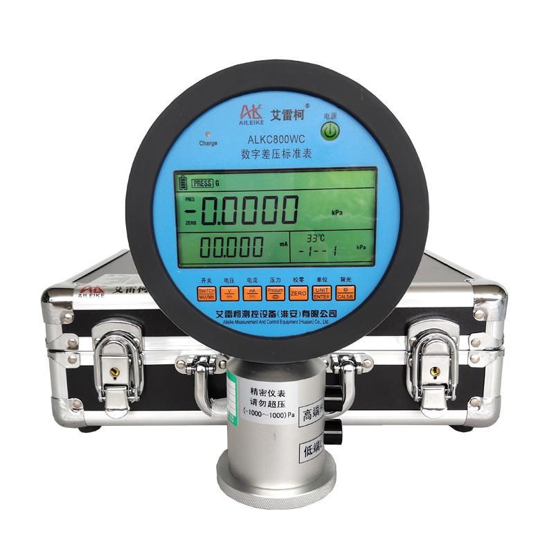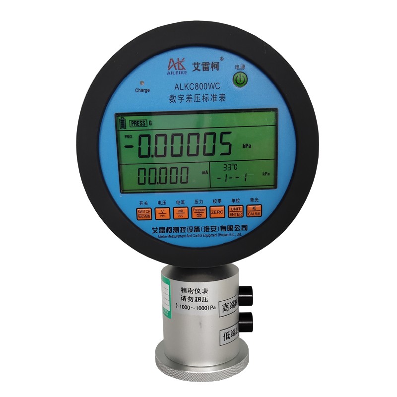 The Digital differential pressure standard meter alkc800wc has optional 5-digit and 6-digit digital display, which can be used in industrial application. It can display current, voltage and pressure fluctuation. The pressure gauge is equipped with 11 optional pressure units, backlight and reset function.