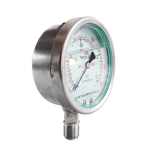 The stainless steel pressure gauge is composed of a pressure guide system (including joint, spring tube, current limiting screw, etc.), a gear transmission mechanism, a number indicator device (pointer and dial) and a case (including case, cover, glass, etc.). The enclosure is air-tight structure, which can effectively protect the internal parts from environmental influence and pollution intrusion. For the instrument filled with liquid (usually silicone oil or glycerin) in the case, it can resist the vibration of the working environment and reduce the influence of the pulsation of medium pressure.