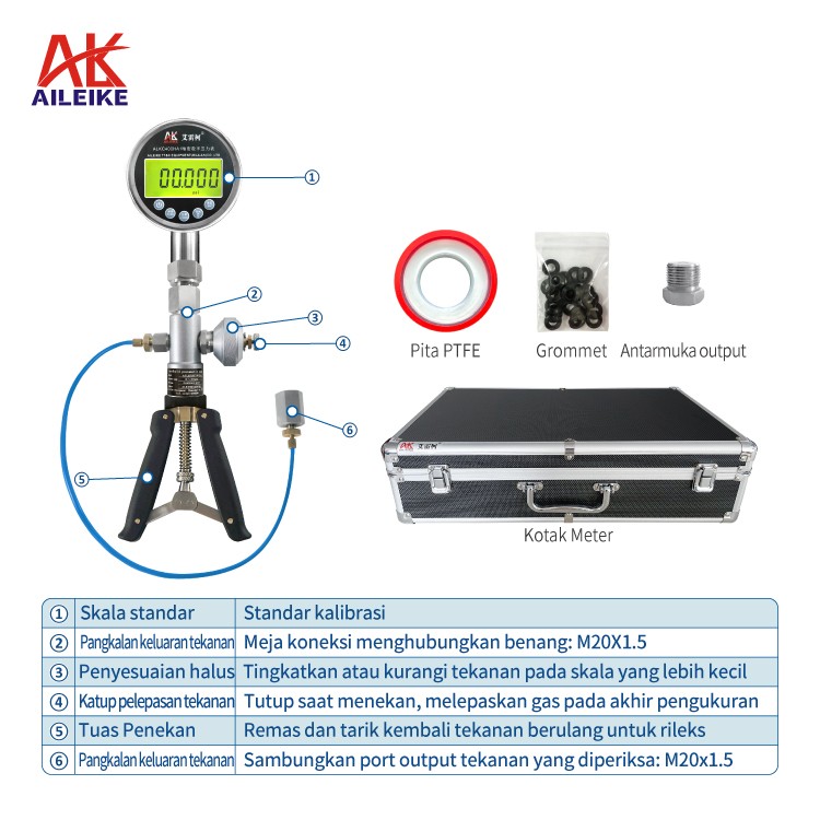 Pompa pneumatik genggam *1 buah Pengukur tekanan digital presisi *1 buah Sumbat port output *1 buah Kotak alat *1 buah Gasket *40 buah Pita penyegel PTFE *1 buah Sambungan konversi tekanan *14 buah (Spesifikasi sambungan sebagai berikut) |