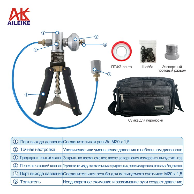 Ручной пневматический насос*1 Порт для перекачки*1 Чехол для переноски*1 Уплотнительные кольца*40 Уплотнительная лента из ПТФЭ*1 Соединители для преобразования давления*9 (Характеристики соединений приведены ниже) |