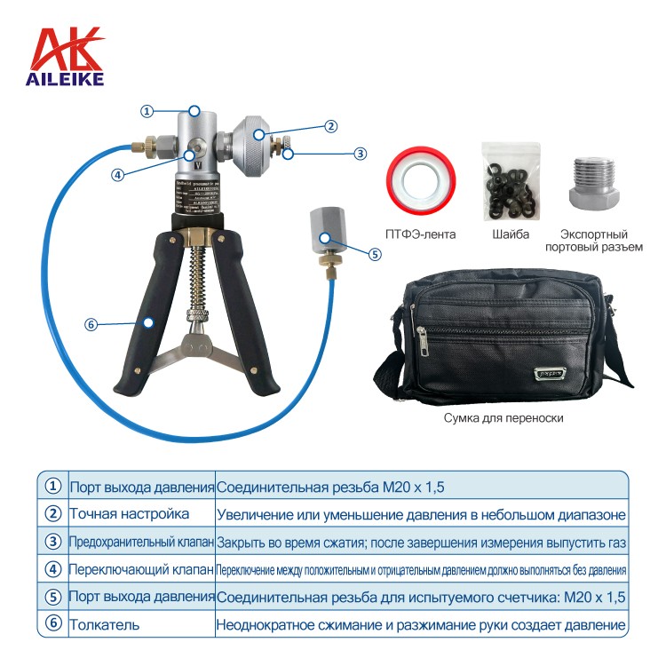Ручной пневматический насос*1 Порт для перекачки*1 Чехол для переноски*1 Уплотнительные кольца*40 Уплотнительная лента из ПТФЭ*1 Соединители для преобразования давления*9 (Характеристики соединений приведены ниже)